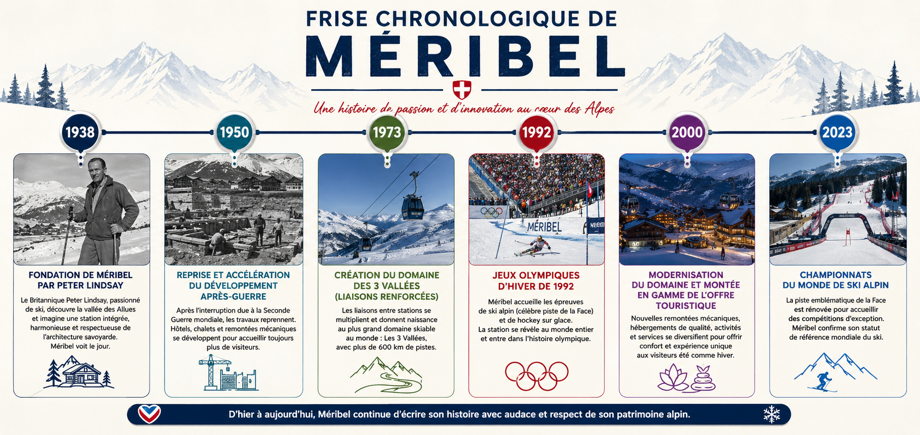 De ses débuts modestes dans une vallée isolée à son statut actuel de station internationale, Méribel incarne une réussite unique dans l’histoire du tourisme alpin. Visionnaire dès sa création grâce à Peter Lindsay, elle a su évoluer sans jamais renier son ADN.