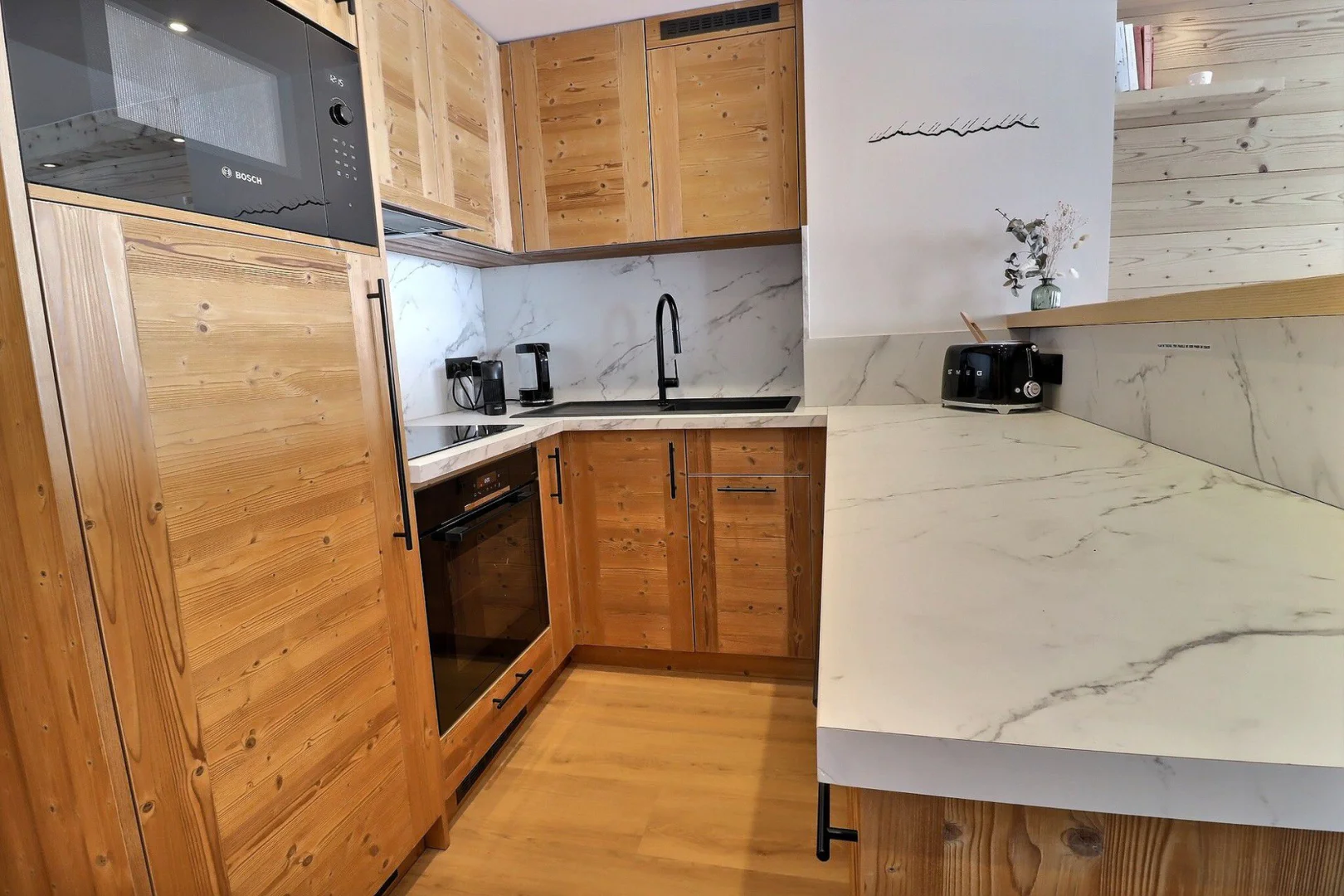 Cuisine ouverte : four, micro-ondes, frigidaire, lave-vaisselle, 4 plaques à induction, hotte, cafetière Nespresso, bouilloire, grille pain