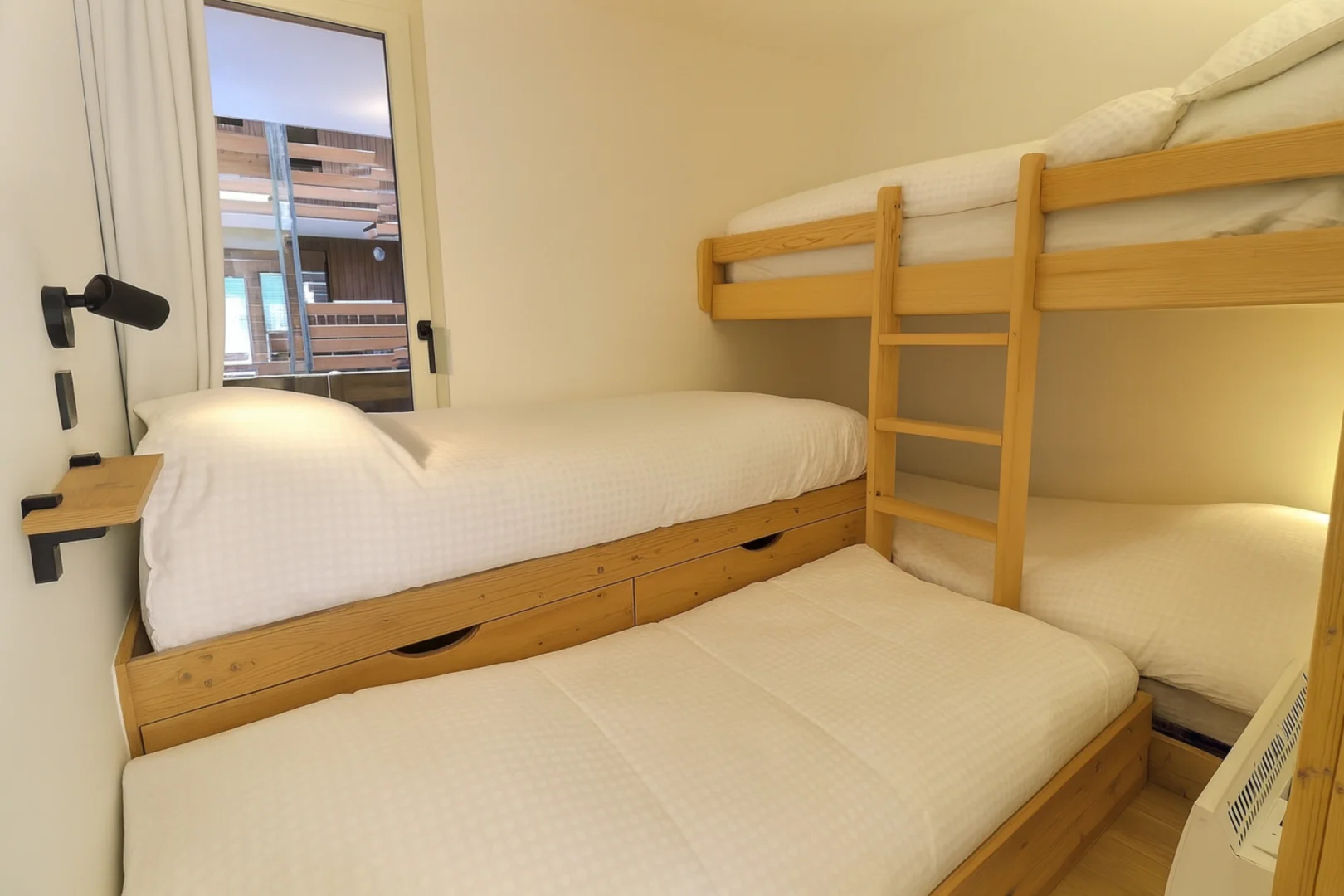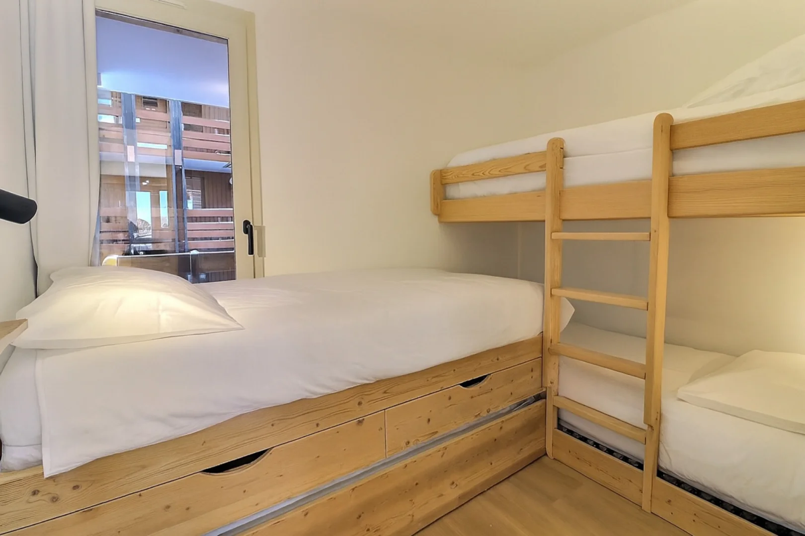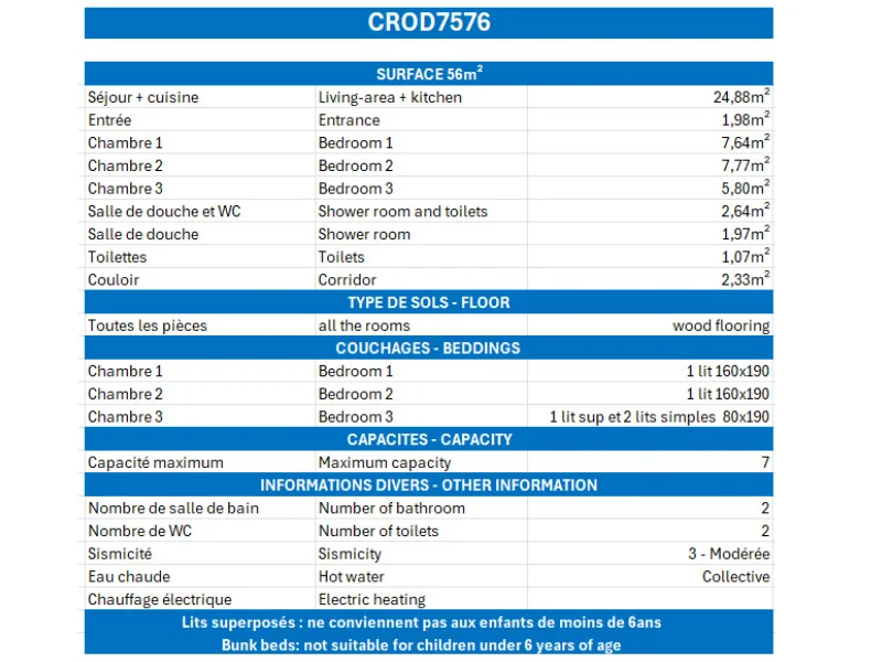 Chambre 3: 1 ensemble de lits superposés (80x190) , 1 lit simple (80x190) et en plus 1 lit tiroir (voir photo)
